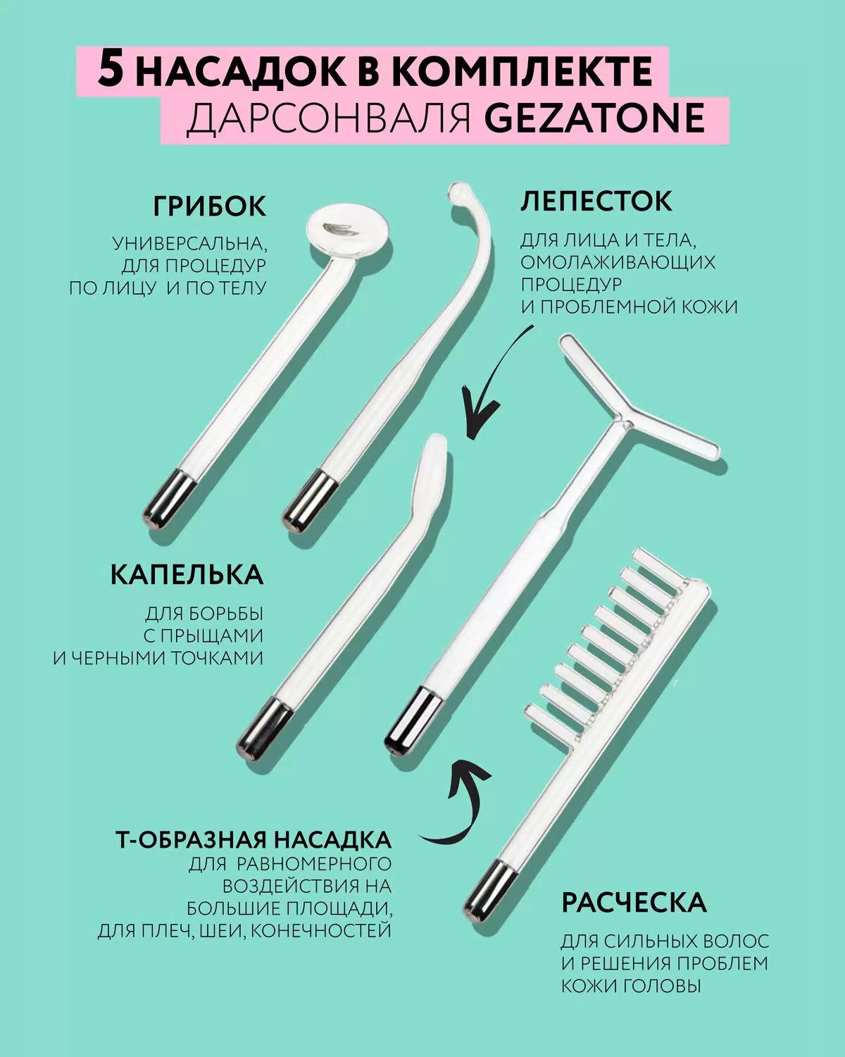Дарсонваль Gezatone BP-7000, 5 насадок, для лица, тела и волос, бирюзовый