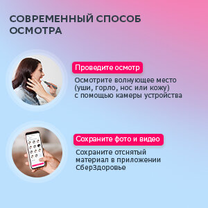| Комплектация | устройство, сменные насадки для осмотра ушей, горла, носа, онлайн консультация с педиатром / терапевтом СберЗдоровья |