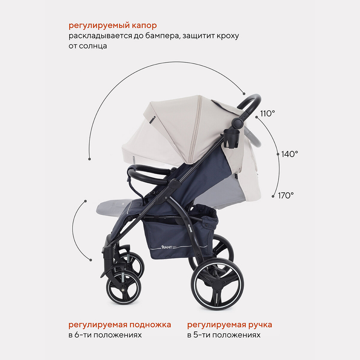 Коляска детская Rant прогулочная, Basic Alpine, цвет бежевый, с корзиной и подстаканником (4670078629838) 16 750 ₽