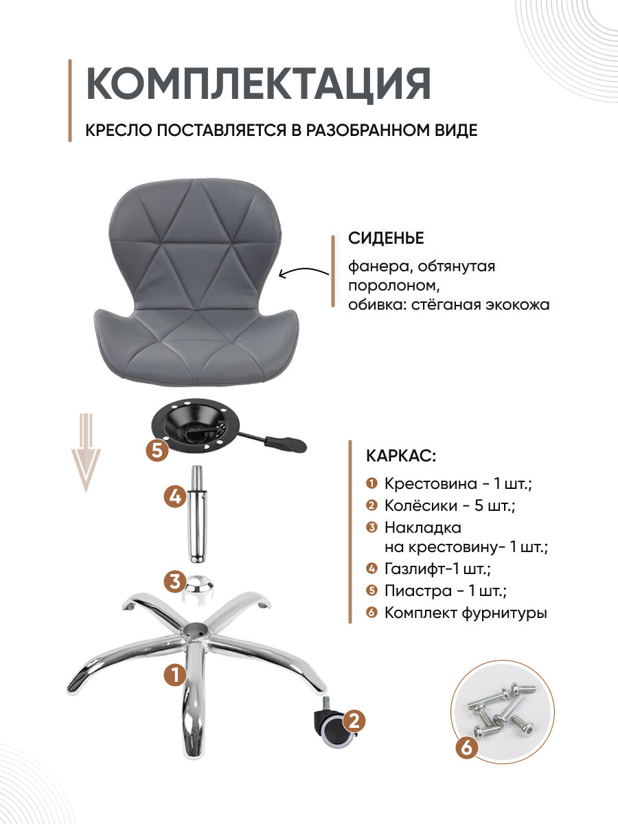 | Комплектация | Сиденье, колёсики, накладка на крестовину, газлифт, пиастра, комплект фурнитуры, инструкция |