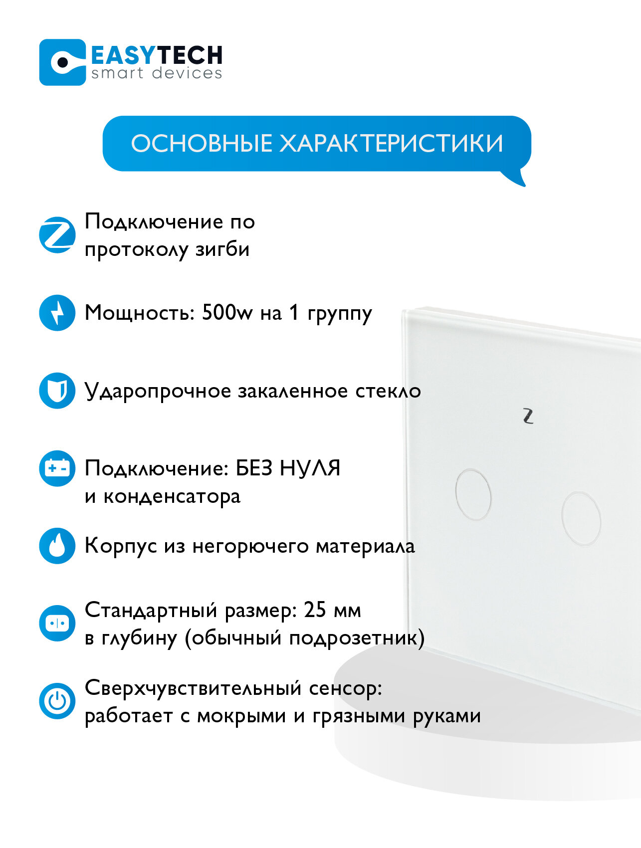 Умный сенсорный Zigbee выключатель с Алисой двухклавишный без нуля на 1000 W Tuya, белый без конденсатора информация: