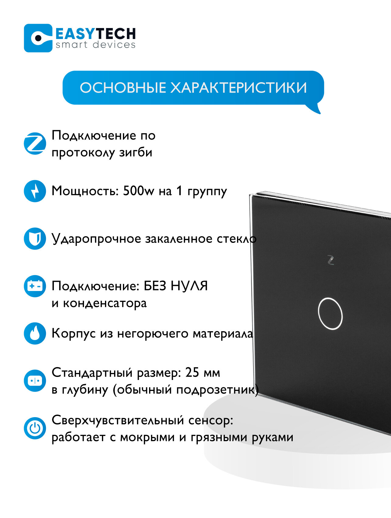 Сенсорный стеклянный выключатель Easy Tech, 300W