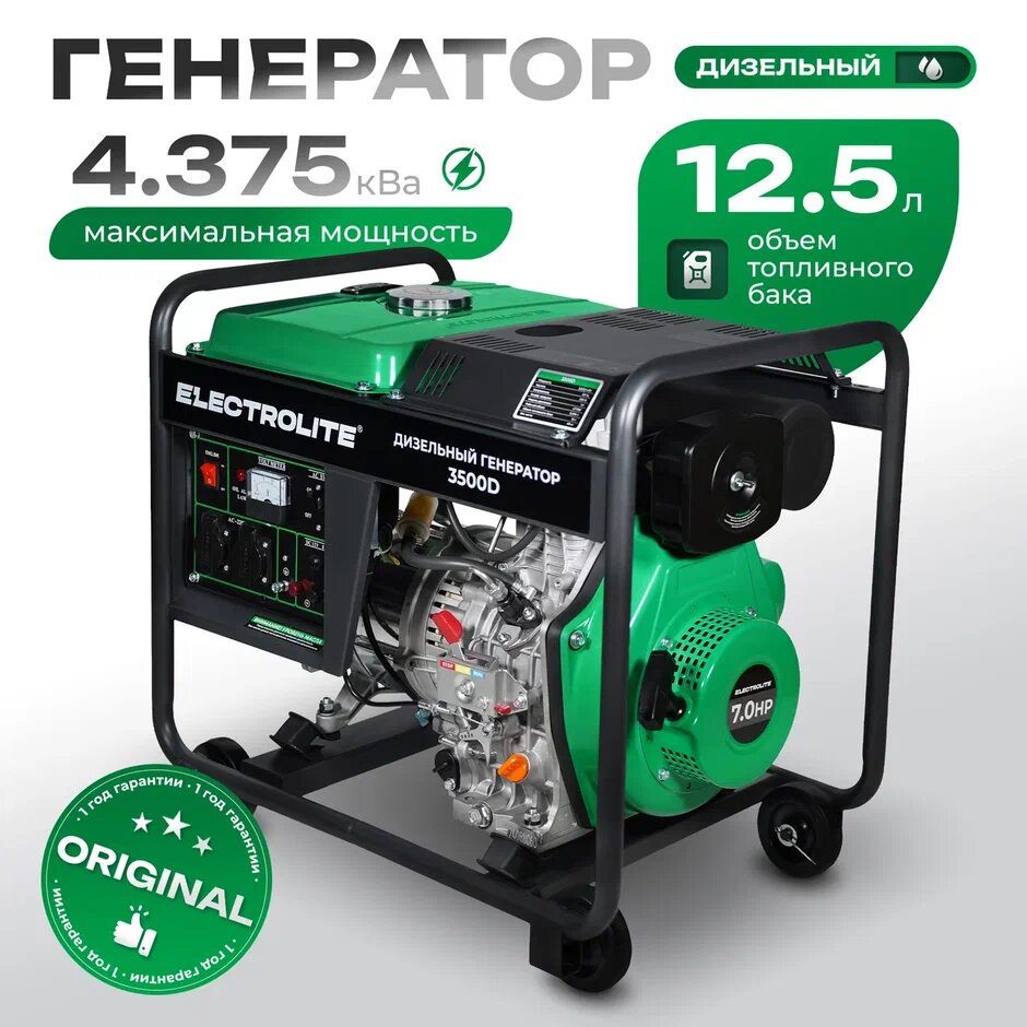 Генератор дизельный / Электрогенератор / Дизельный генератор / Электростанция Electrolite 3500D (4,375 кВа пиковая нагрузка , 220 В / 12 В, 3 / 3,5 кВт, 50 Гц, 7 л. с, ручной стартер ) 67 345 ₽