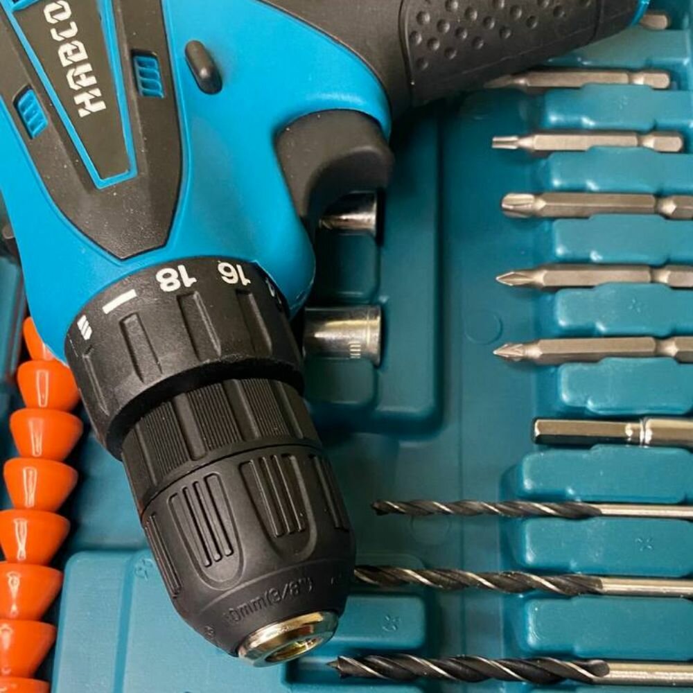 Дрель-шуруповерт аккумуляторный ударный 12В HABCO, 2 аккумулятора 1,5Ah, Пластиковый кейс + набор инструментов информация: