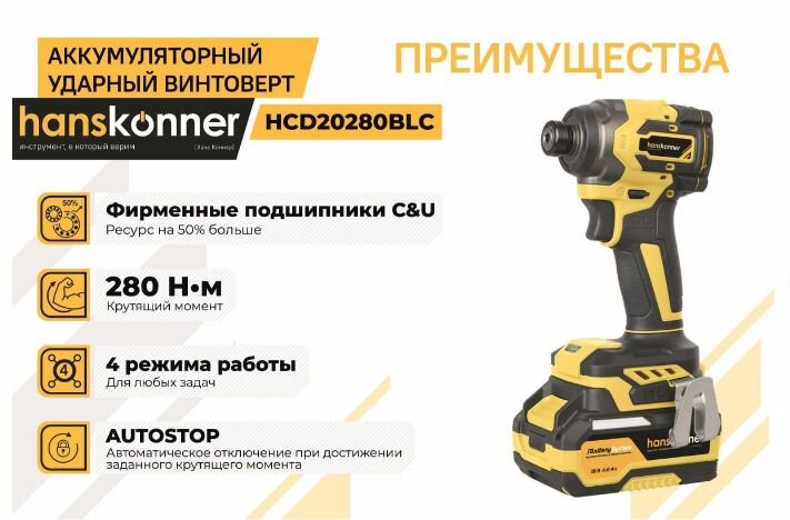 Отзывы на Винтоверт аккумуляторный Hanskonner HCD20280BLC ударный бесщеточный (18В, 1акк*4Ач 1BatterySystem, 280Нм, 4скор, кейсHS)