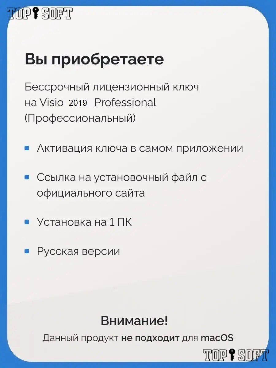 | Дополнительная информация | Электронный ключ активации Microsoft Visio 2019 Pro для Windows 10 или 11 |