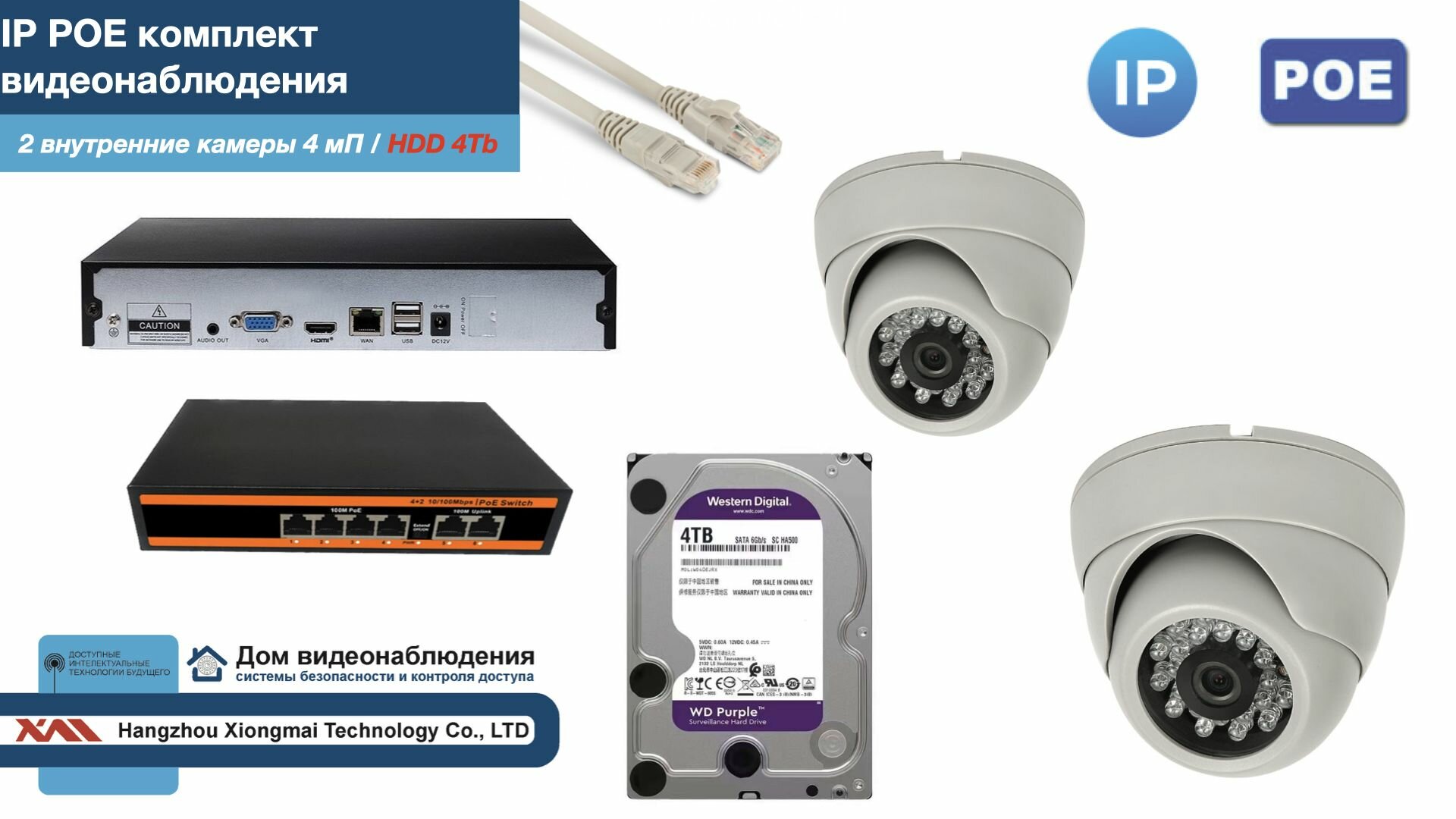 10 цен на Полный IP POE комплект видеонаблюдения на 2 камеры (KIT2IPPOE300W4MP-HDD4Tb)