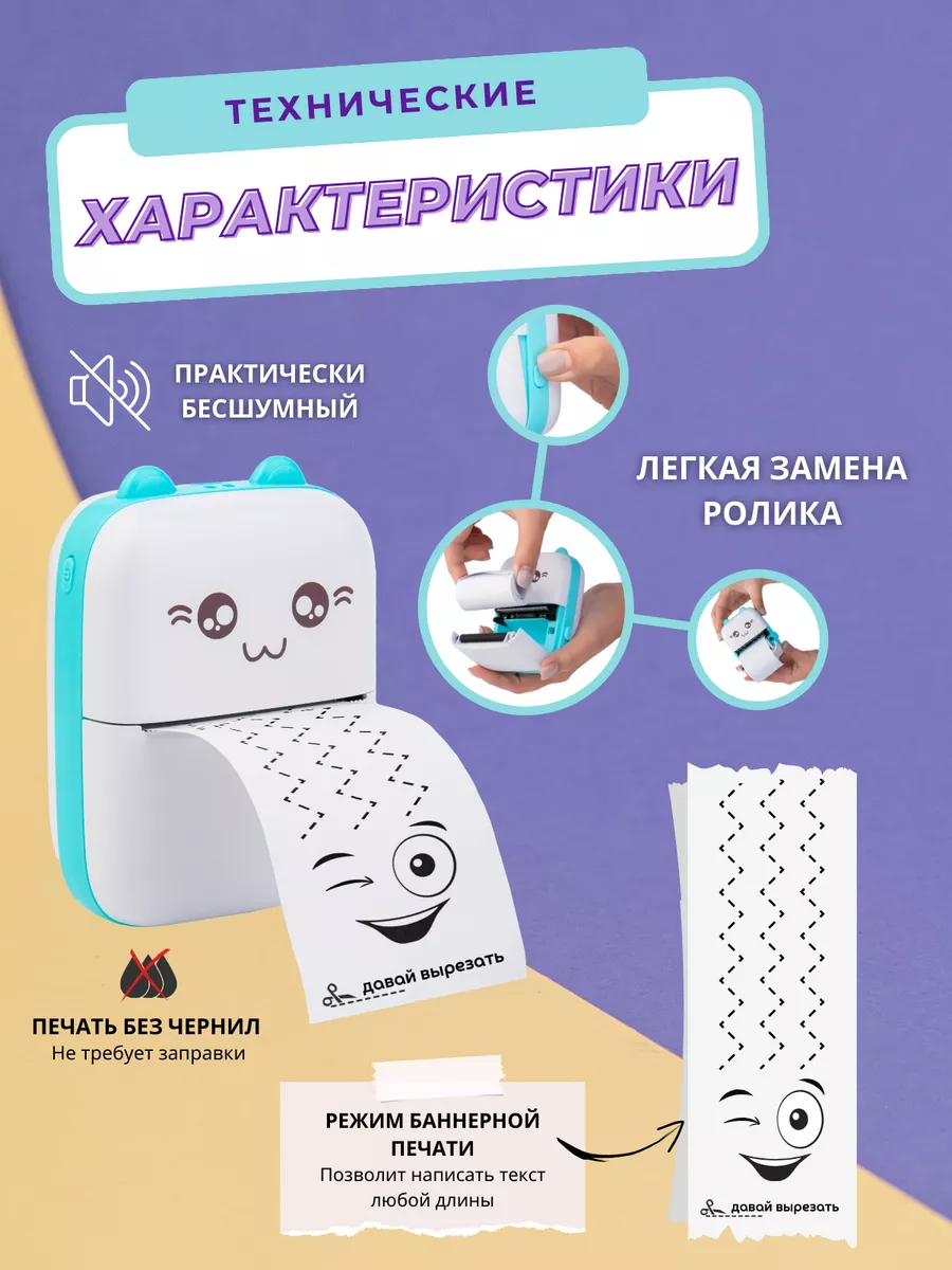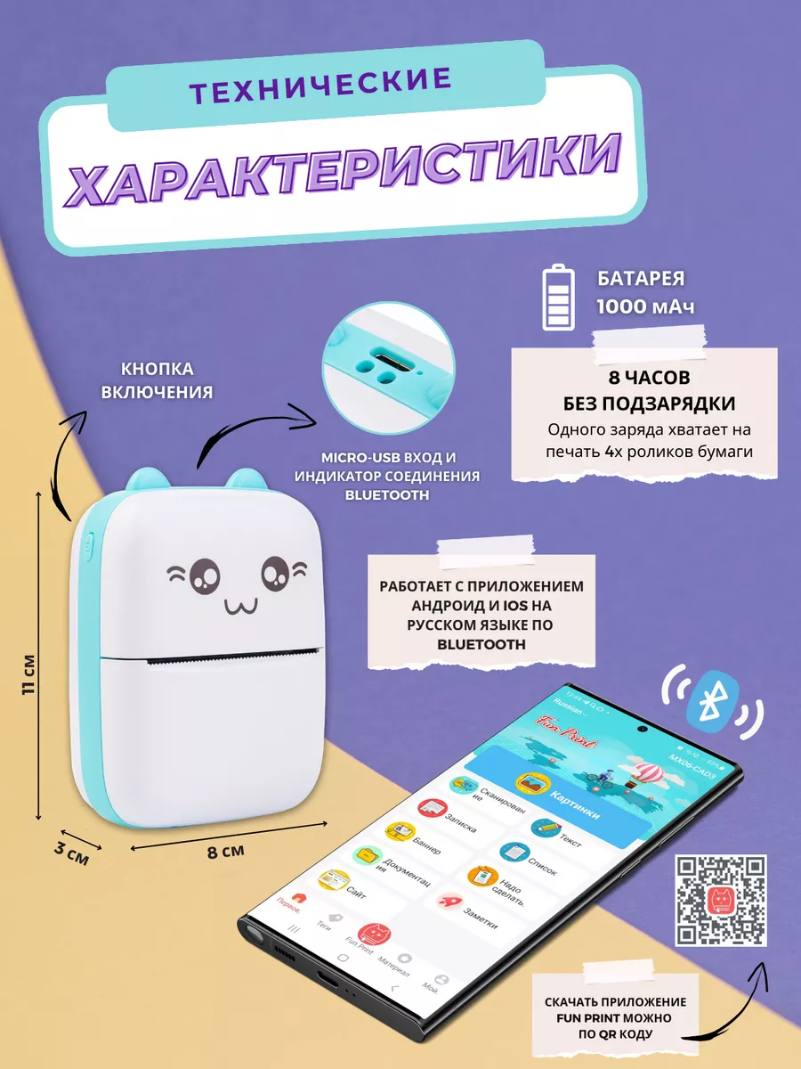 | Комплектация | принтер портативный, кабель для зарядки, инструкция, 6 рулонов термобумаги,5 рулонов самоклеящийся, 3 цветных рулона, 6 фломастеров |