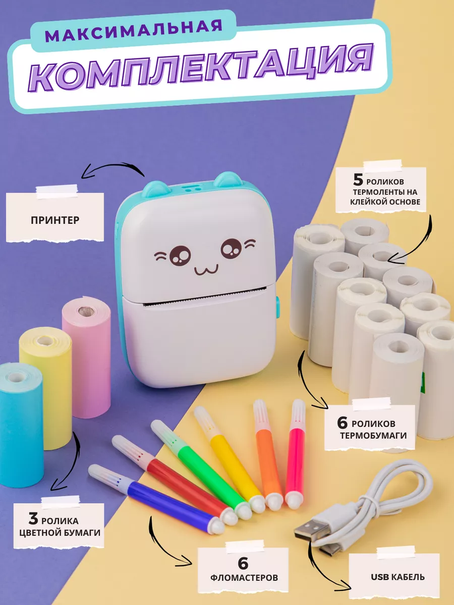 | Комплектация | принтер портативный, кабель для зарядки, инструкция, 6 рулонов термобумаги,5 рулонов самоклеящийся, 3 цветных рулона, 6 фломастеров |