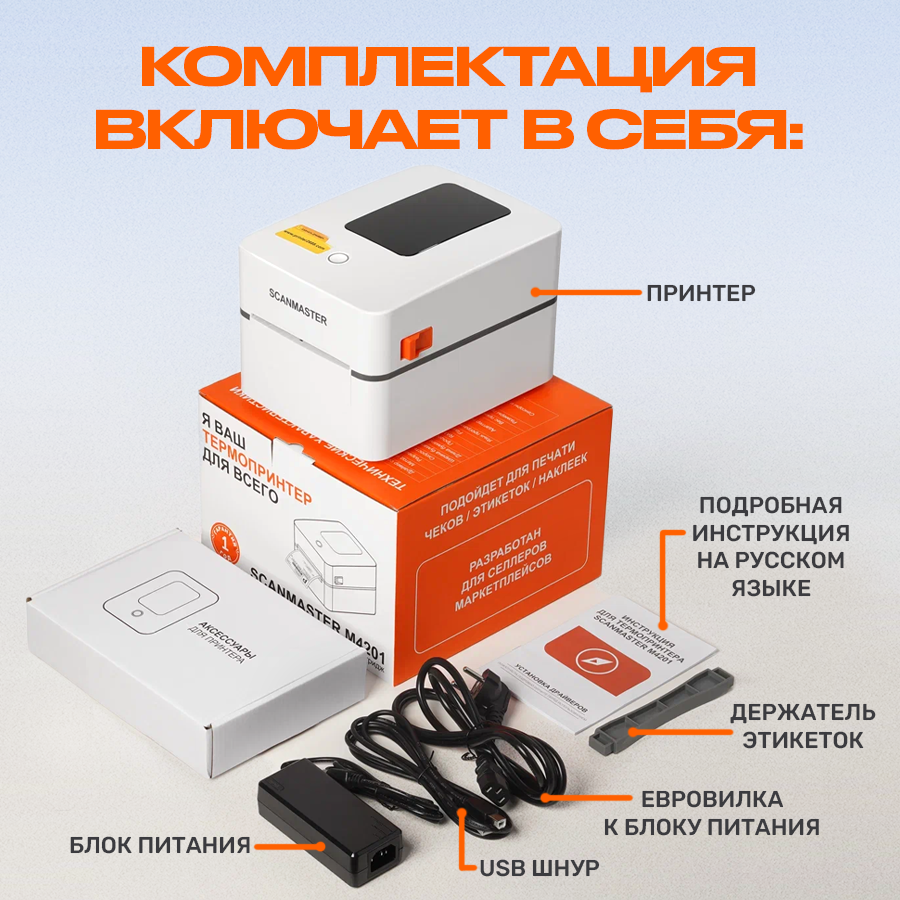 | Комплектация | Принтер, USB кабель, блок питания, инструкция на русском, рулон этикеток 58x40 |