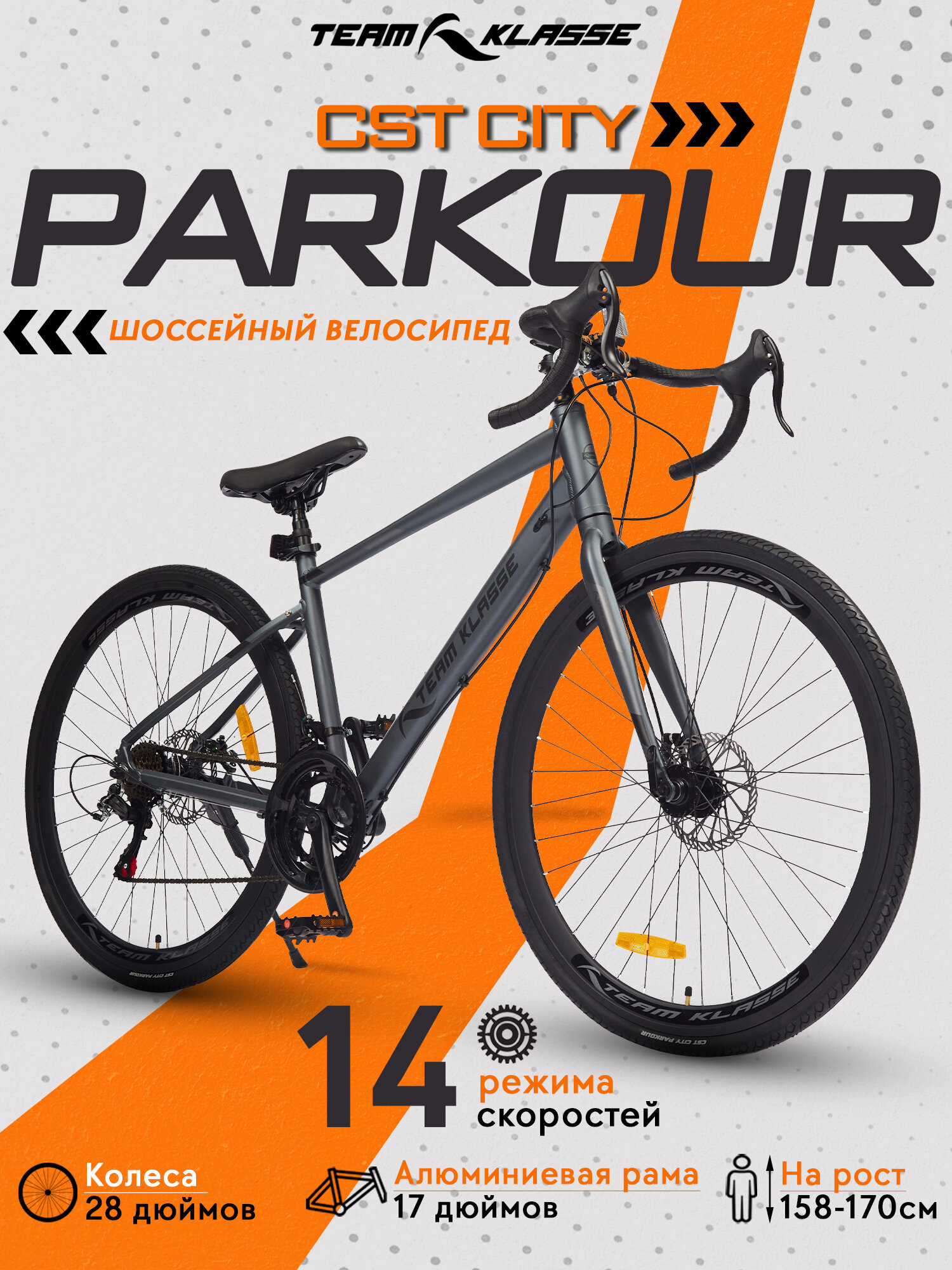 Велосипед Team Klasse MA-4-C, шоссейный, 16 скоростей, диаметр колес 28", рама 50 см, тормоз Shimano, серый 74 620 ₽