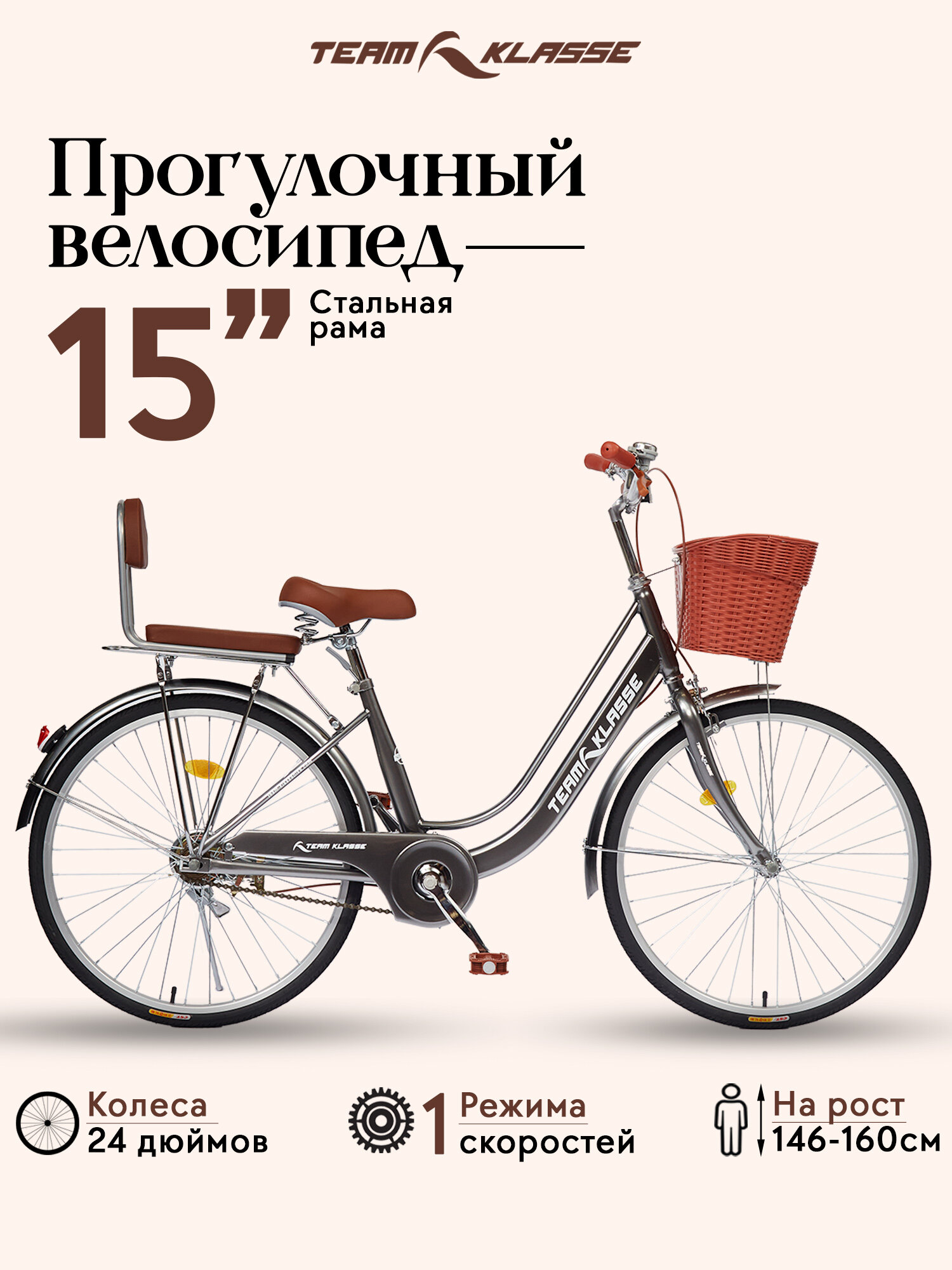 Прогулочный велосипед Team Klasse E-1-B, темно-серый, диаметр колес 24 дюймов информация: