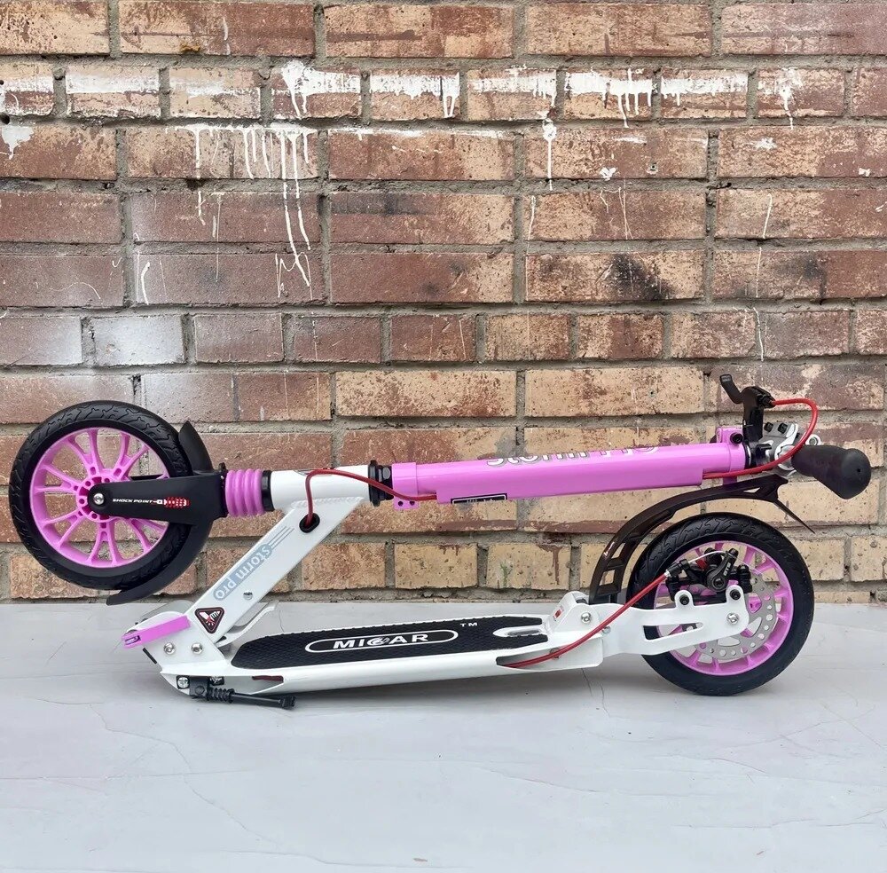 Отзывы на Самокат двухколесный MICAR Storm Pro c колёсами 200 мм, складной с амортизаторами и ручным дисковым тормозом бело-розовый