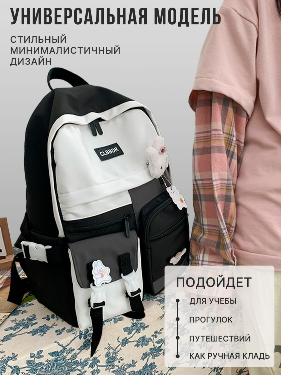 Рюкзак универсальный школьный с ручками и брелоками, рюкзак в корейском стиле для подростков / черный, белый с брелоками 1 898 ₽