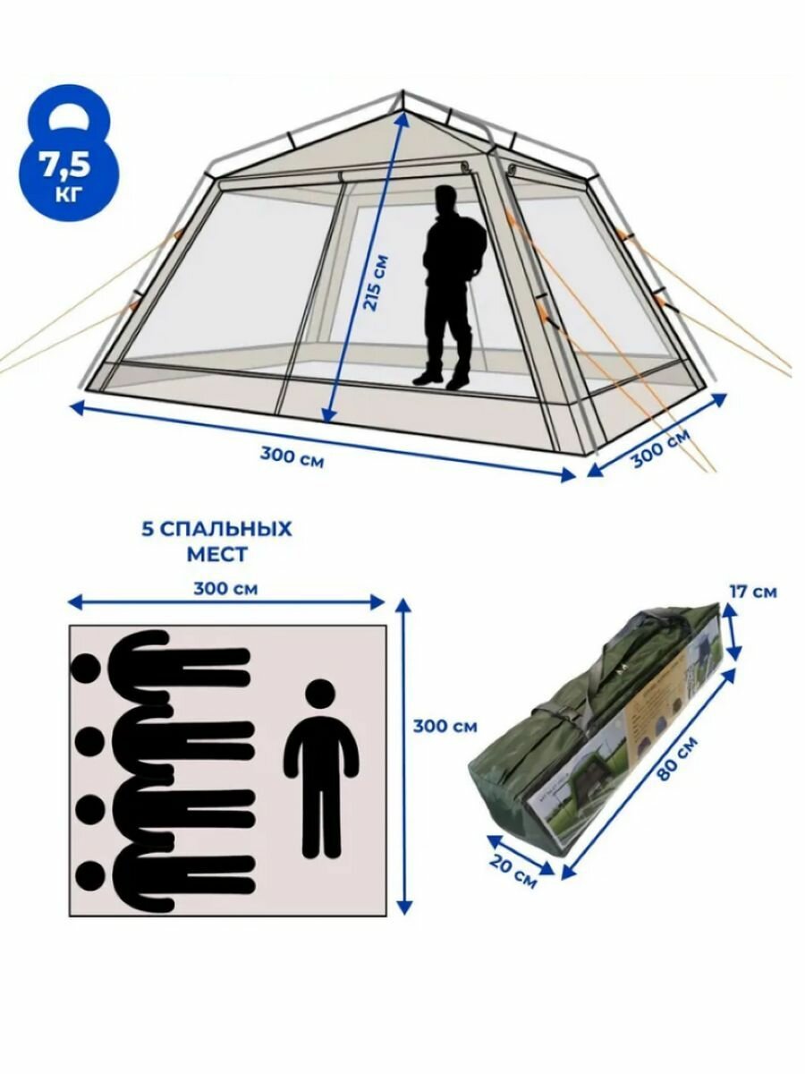 | Габариты внешней палатки(ДxШxВ) | 300x300x215 cм |