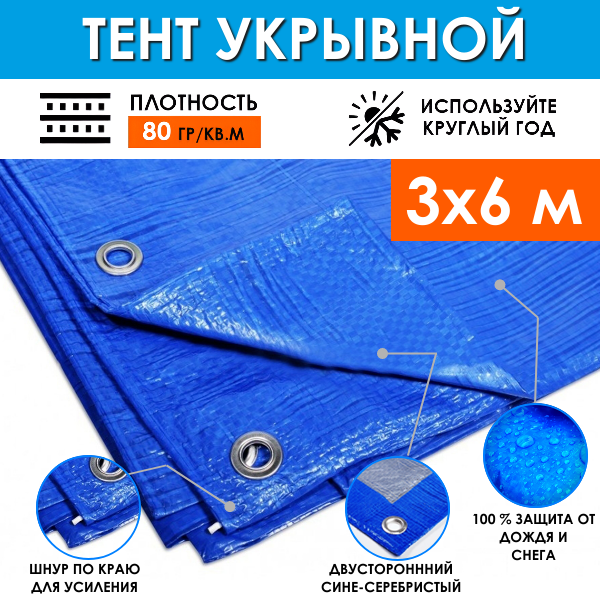 Тент укрывной защитный 3х6 м "Тарпикс 80" с люверсами, универсальный садовый тарпаулин на качели, бассейн и автомобиль, туристический полог шатер информация: