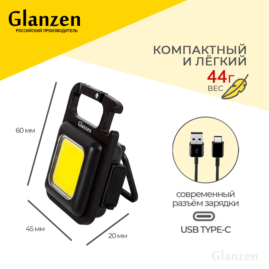 10 цен на Фонарь светодиодный аккумуляторный USB GLANZEN UFL-0500-06, c карабином