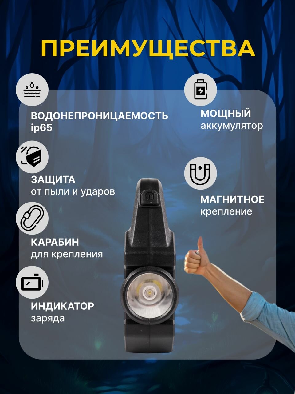 | Особенности | влагозащита / дневной белый свет / зарядное устройство / прожектор |