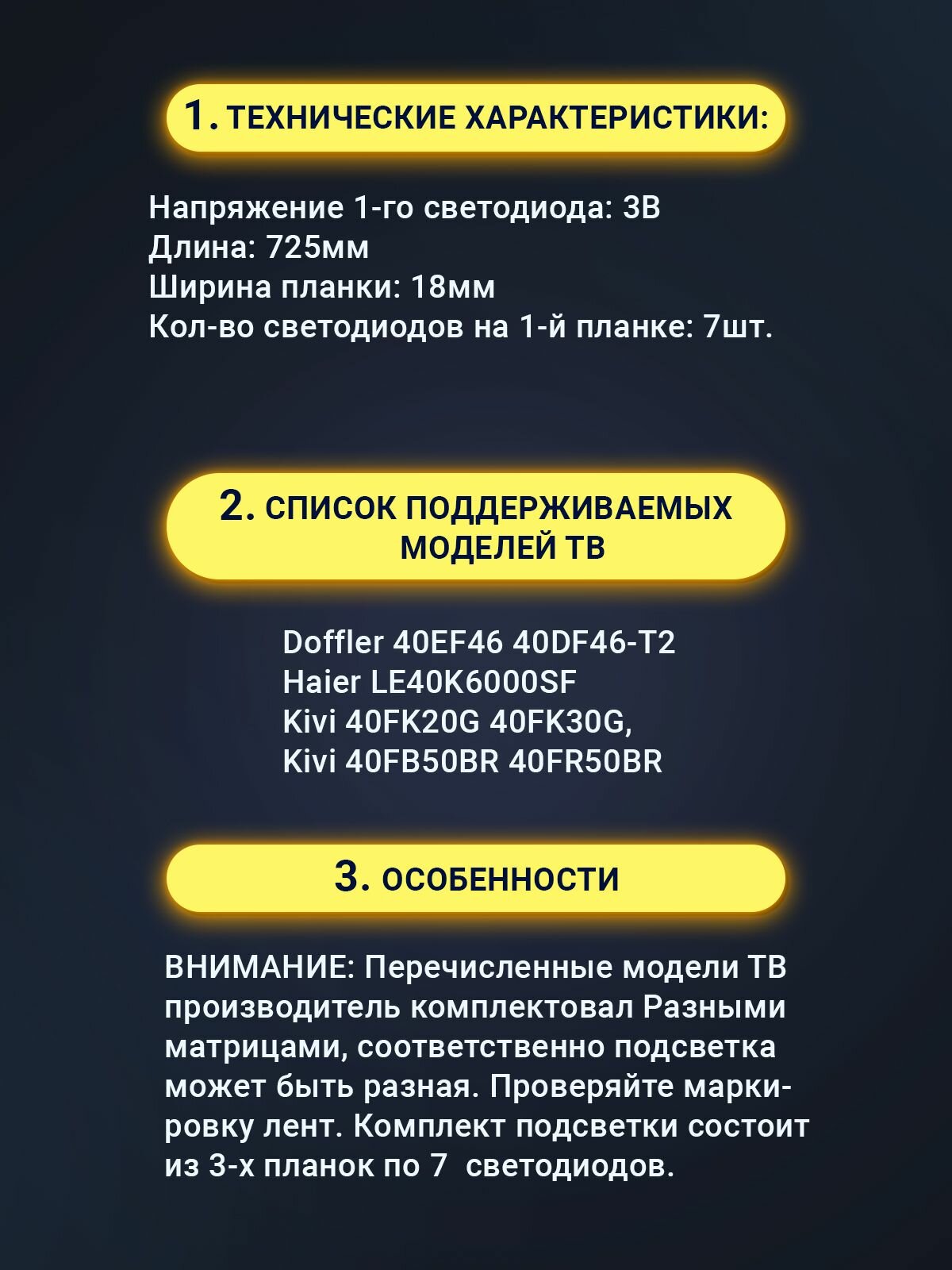 10 цен на Подсветка для ТВ Doffler 40EF46, 40DF46-T2 Haier LE40K6000SF, Kivi 40FK20G, 40FK30G, 40FB50BR, 40FR50BR (комплект 3шт.)