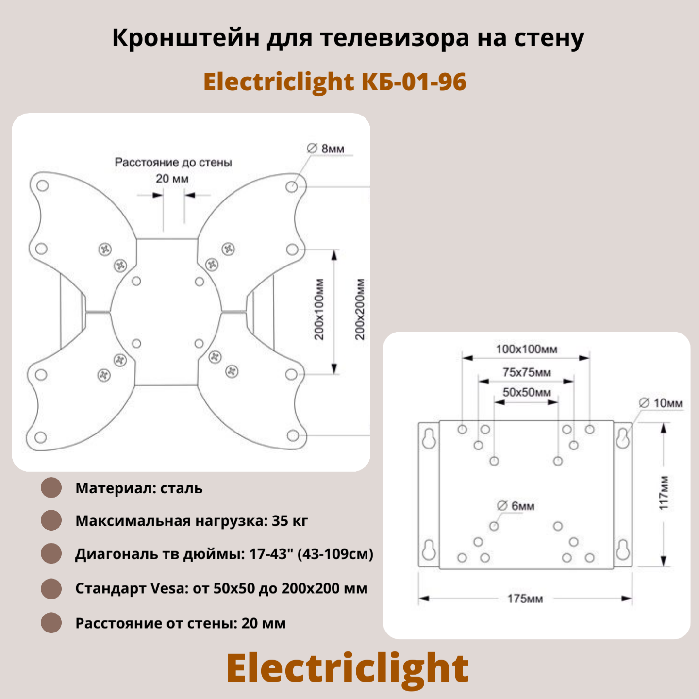 Кронштейн для телевизора на стену фиксированный с диагональю 17"-43" Electriclight КБ-01-96,черный информация:
