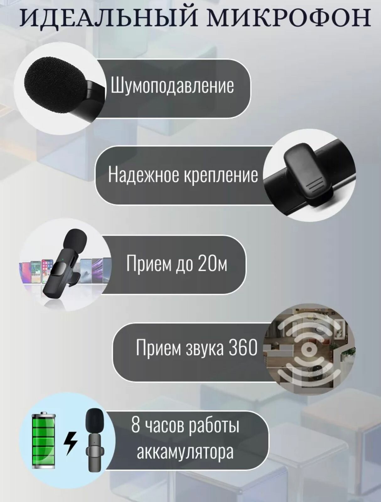 | Дополнительная информация | Беспроводной петличный микрофон, петличный микрофон для телефона, беспроводной микрофон петличка type-c, микрофон для планшета, микрофон для компьютера петличный микрофон для смартфона, микрофон для записи видео и аудио контента, микрофон с шумоподавлением, петличный микрофон для звукозаписи. |