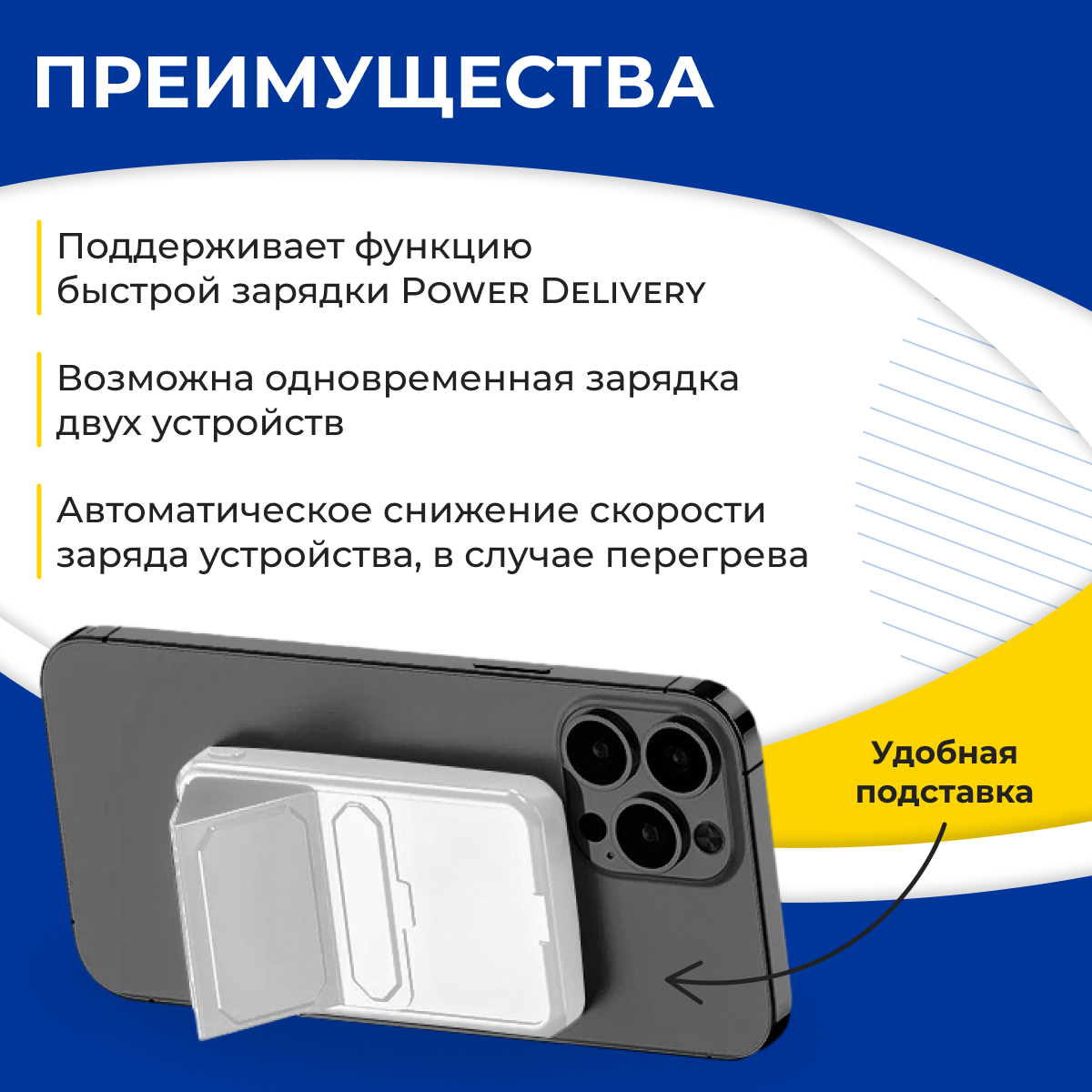 | Дополнительная информация | магнитный беспроводной повербанк совместим со всеми телефонами Apple iPhone, обладающими функцией MagSafe; быстрая зарядка; Зарядное устройство для смартфона с подставкой; 2 разъёма - USB Type-C, USB Type-A. |