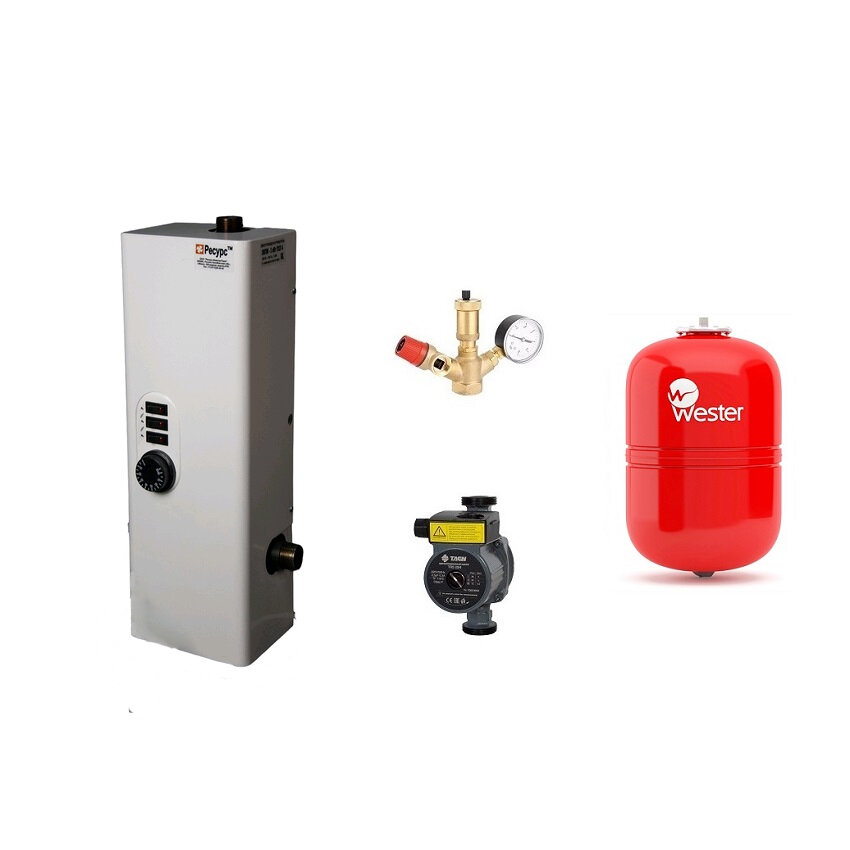 Электрический котел Ресурс ЭВПМ 9 кВт (А), насос TAEN 25/6, TAEN Группа безопасности, Бак Wester WRV 8 информация: