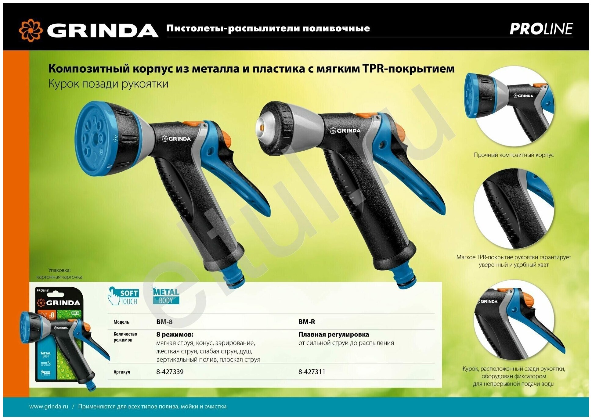 GRINDA BM-R, плавная регулировка, курок сзади, металлический с TPR, поливочный пистолет, PROLine (8-427311) информация: