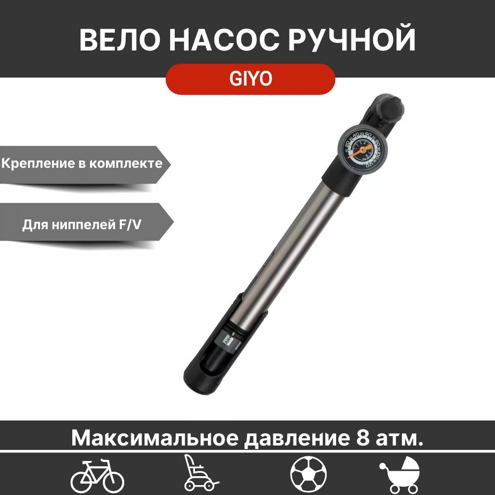 Велосипедный насос Giyo GP-993, металлический, с Т-образной ручкой, манометр, 120 PSI (8атм) presta/ информация: