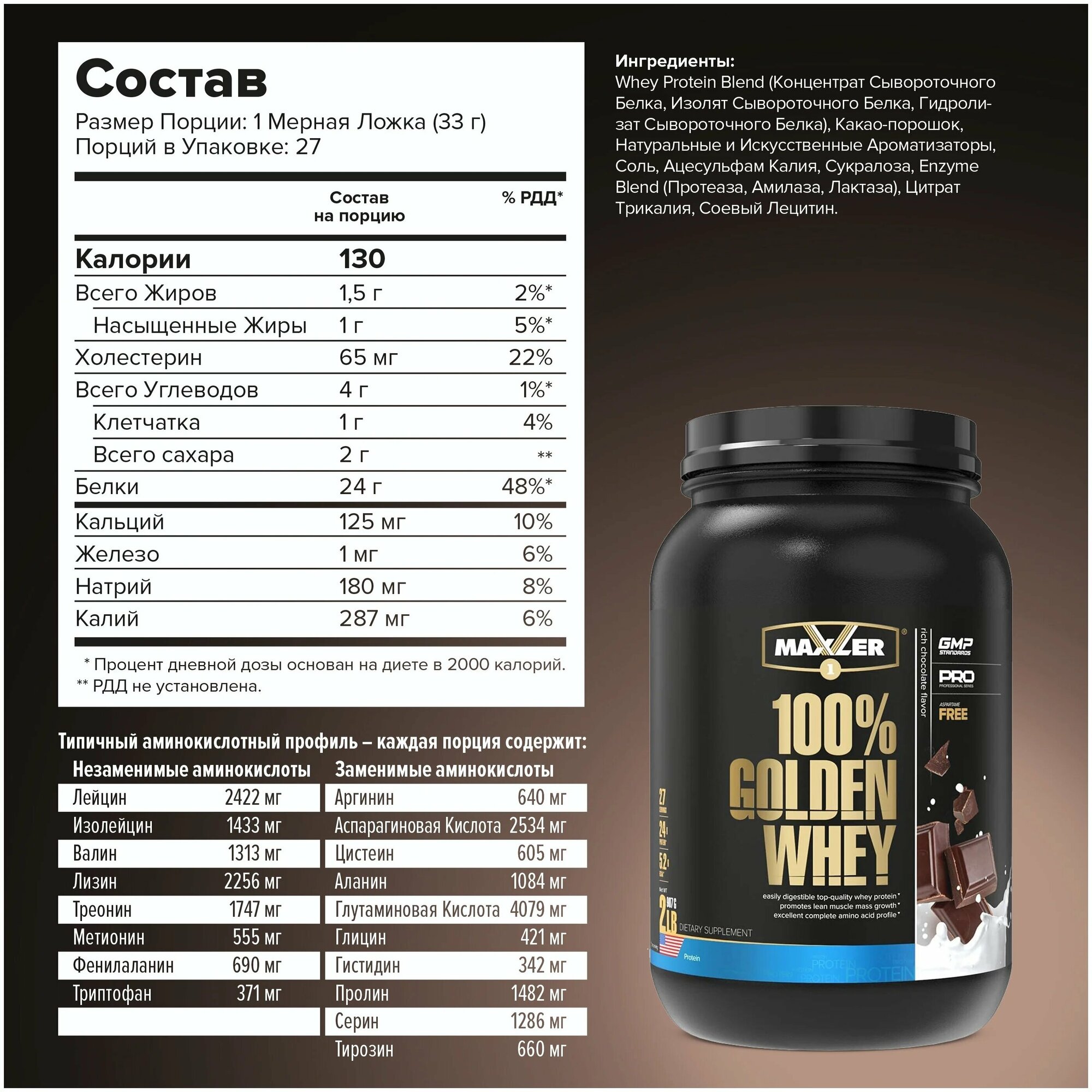 Комплексный протеин MAXLER (USA) 100% Golden Whey 910 г, Насыщенный шоколад информация: