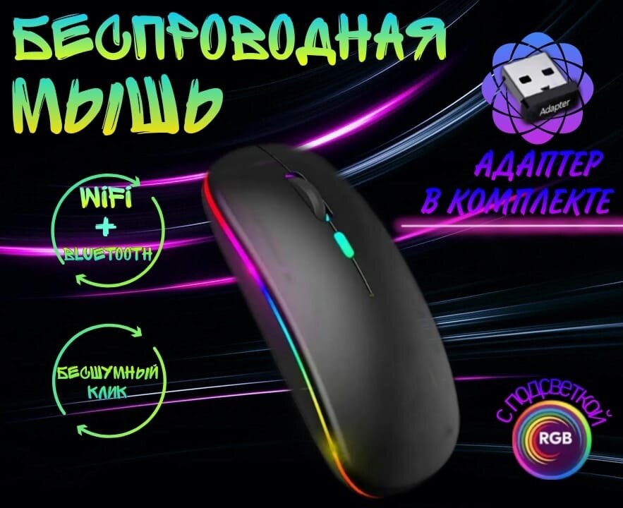 Беспроводная мышка для компьютера со встроенным аккумулятором/ Бесшумная блютуз компьютерная мышь с подсветкой RGB/ Bluetooth/ WiFi 2.4 гц