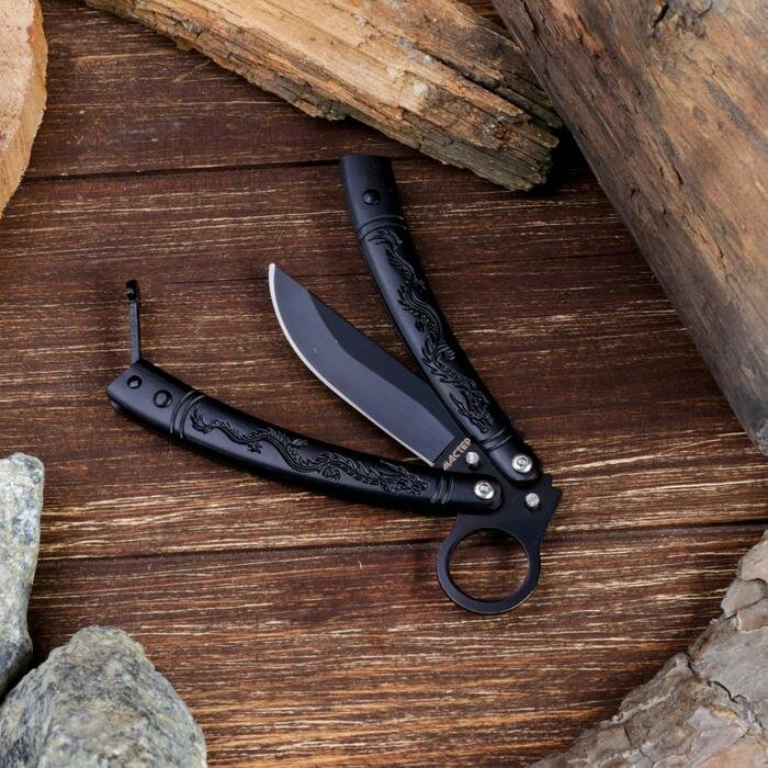 10 цен на Нож-бабочка "Мастер К", лезвие с прямым обухом 7,5см, рукоять с драконами 9,5см, кольцо