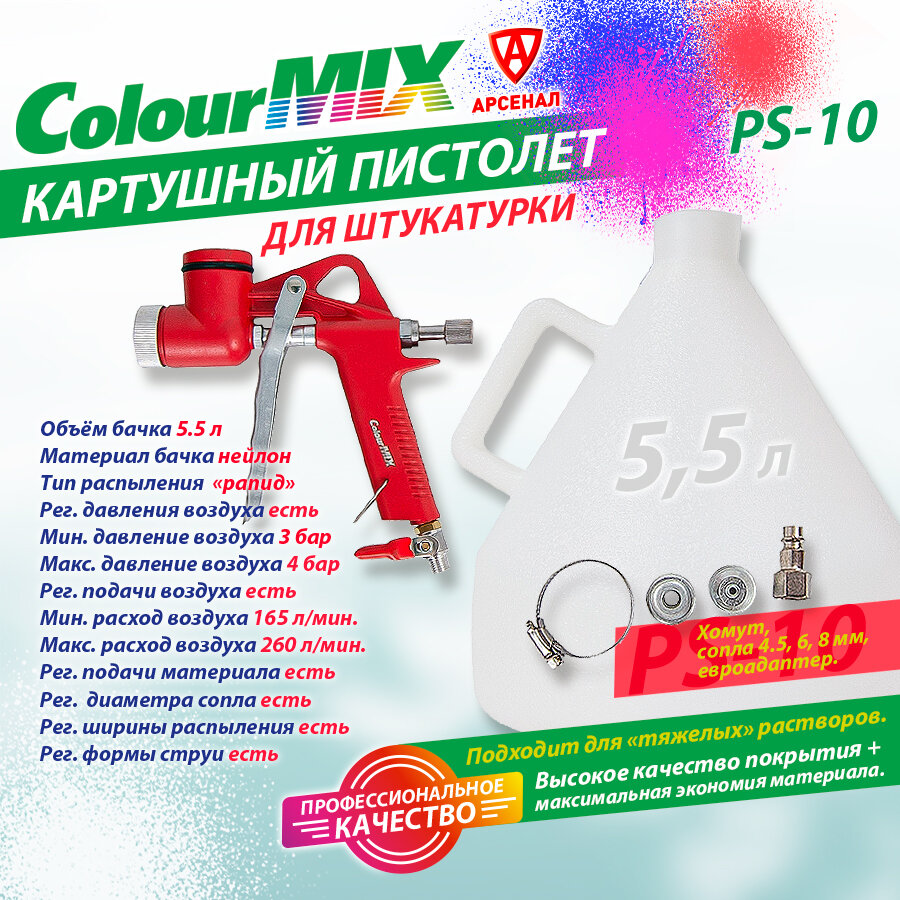 Пистолет картушный для штукатурки ColourMix 5,5л (сопла 4,5*6*8 мм), PS10 информация: