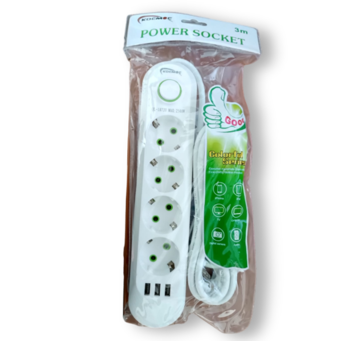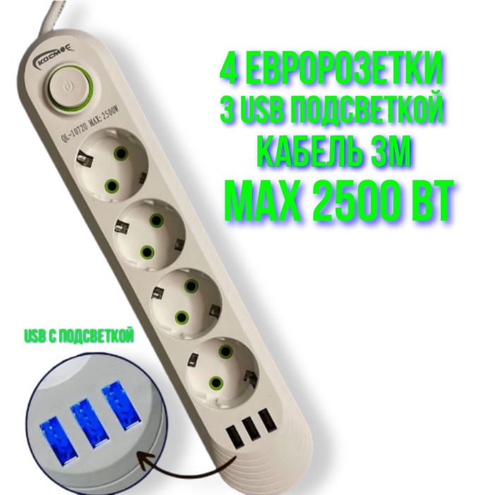 Сетевой фильтр, удлинитель, 4 розетки, 3 USB, 3 метра, белый, 10А информация: