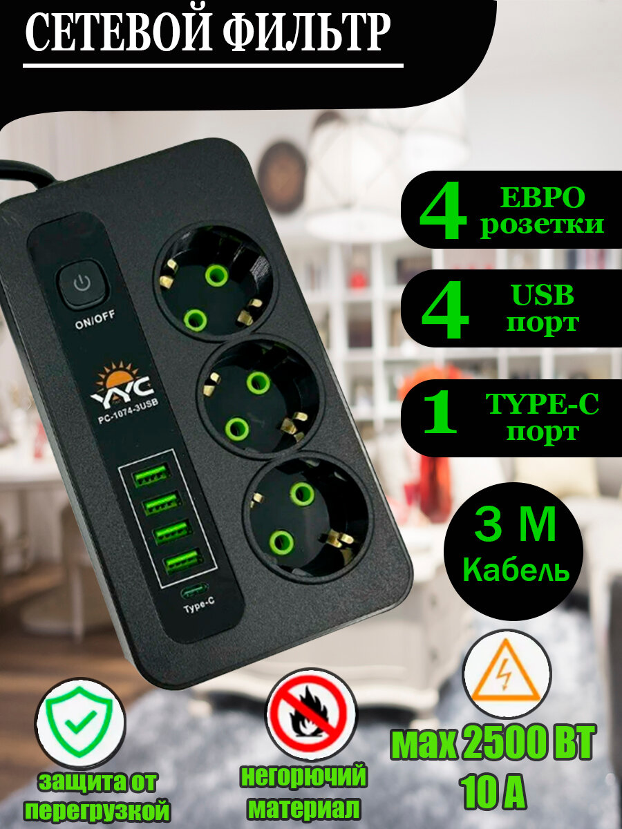 10 цен на Сетевой фильтр удлинитель 3 розетки с USB type-C