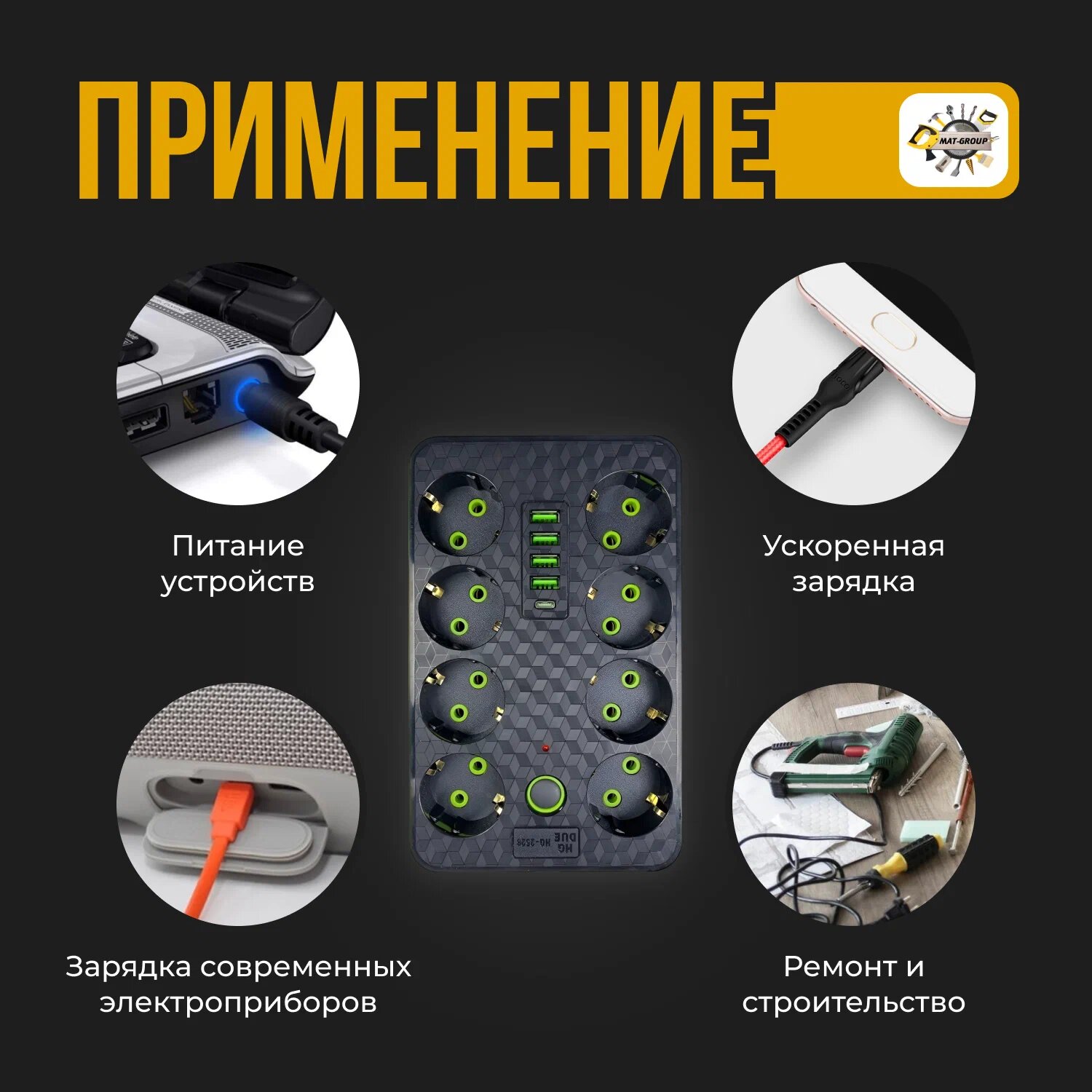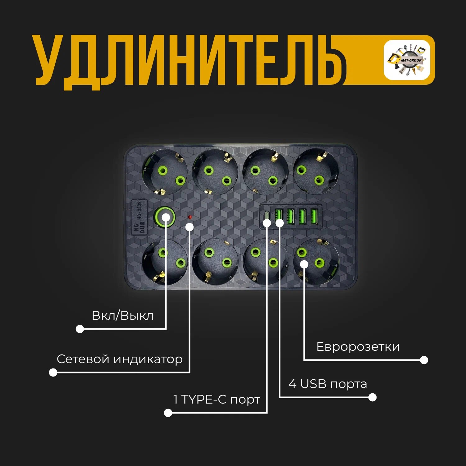 Сетевой фильтр 2606 с 6 розетками 2USB + 1 Type-C / Многофункциональный удлинитель с предохранителем