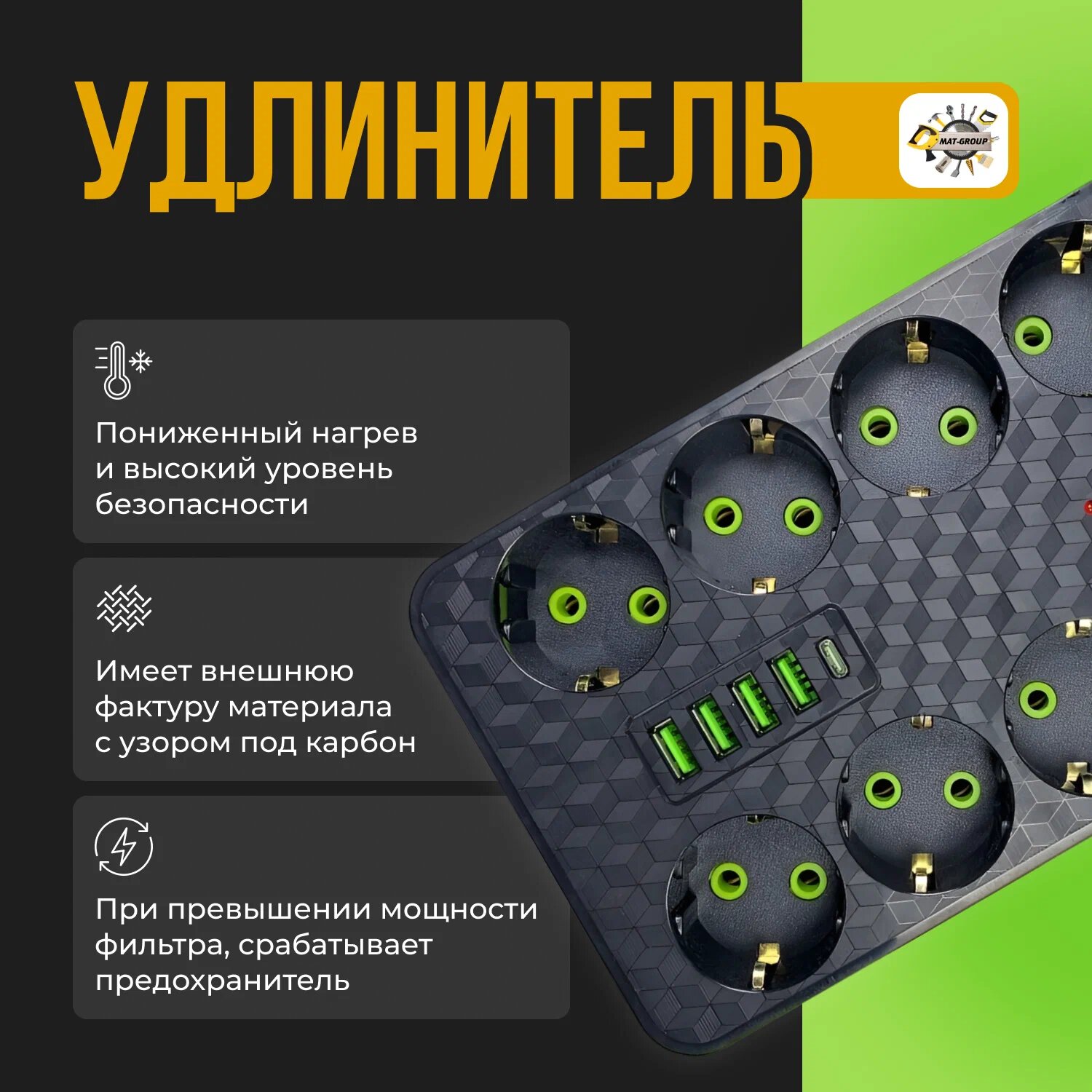Удлинитель - сетевой фильтр с 4 USB и 1 type-C 2503 849 ₽