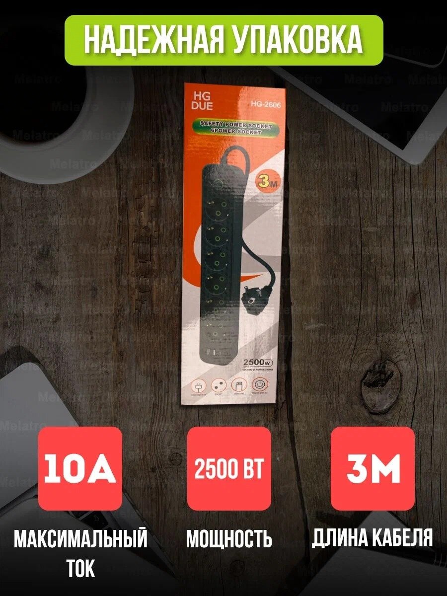 Сетевой фильтр 2606 с 6 розетками 2USB + 1 Type-C / Многофункциональный удлинитель с предохранителем информация: