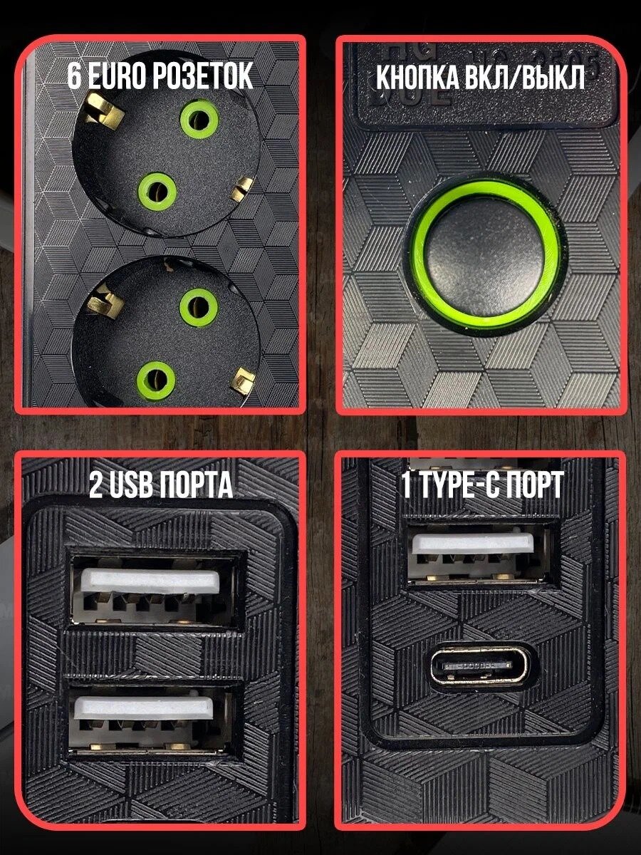 Отзывы на Сетевой фильтр 2606 с 6 розетками 2USB + 1 Type-C / Многофункциональный удлинитель с предохранителем