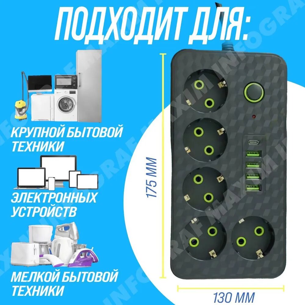 10 цен на Сетевой фильтр 2505 с 5-ю розетками + 4-мя USB + 1-м Type-C