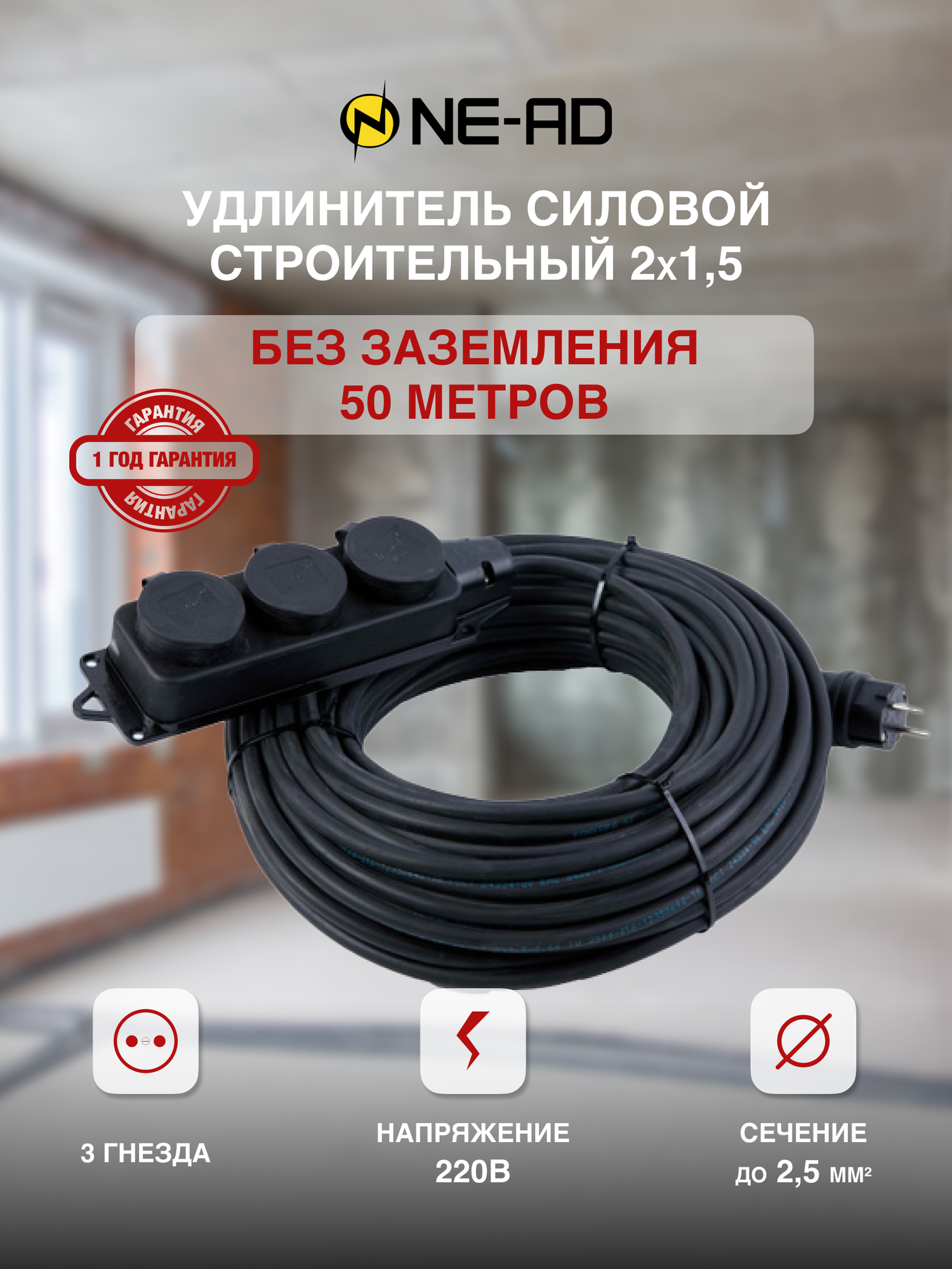 Удлинитель силовой строительный с заземлением NE-AD 2x1,5-50m-IP44 в бухте электрический сетевой садовый уличный для газонокосилки 50 метров 3 розетки 16А информация: