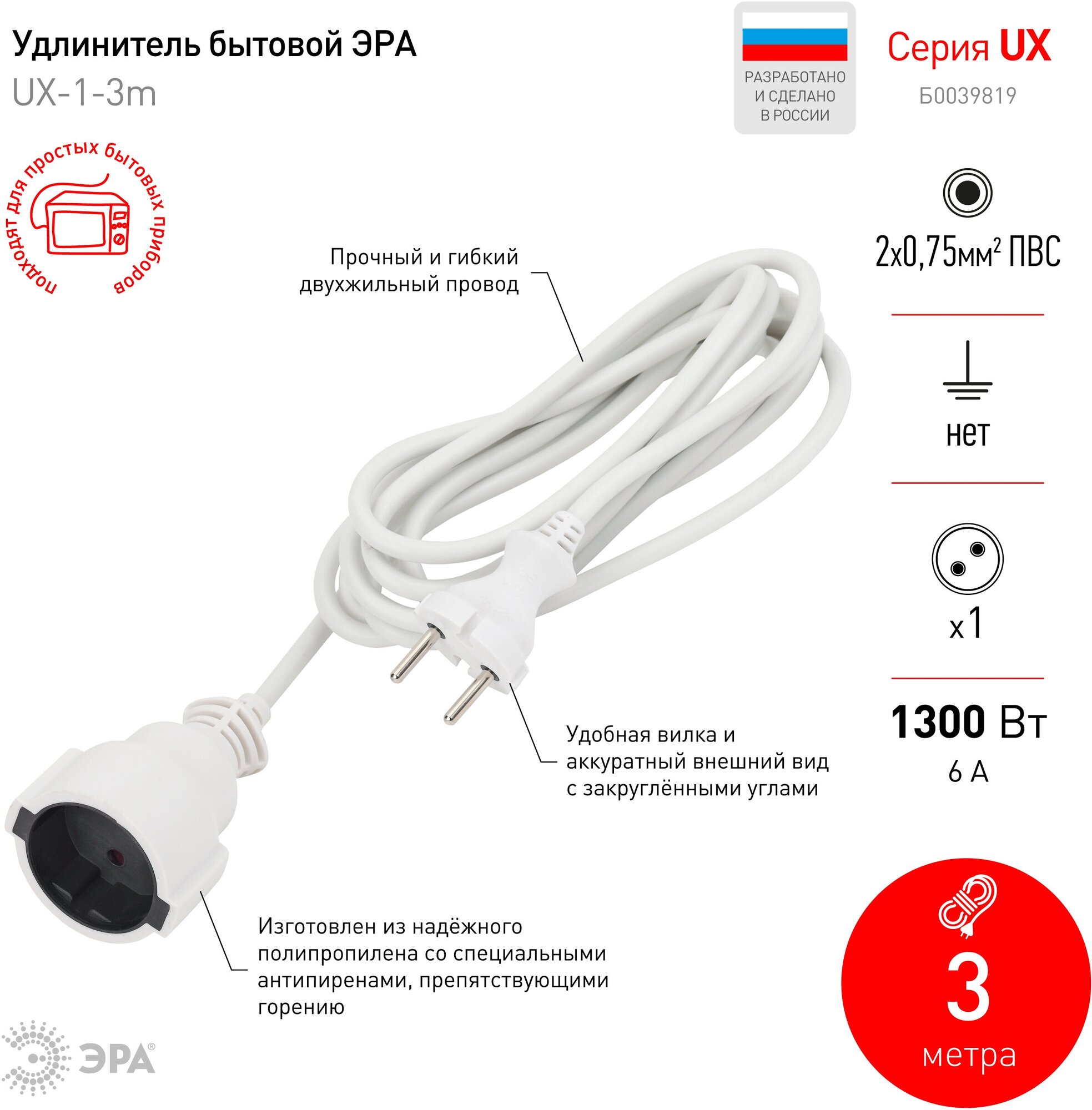 Отзывы на Удлинитель электрический ЭРА UX(6)-1-3m без заземления 1 розетка 3м ПВС 2x0,75мм² 6А арт. Б0039819 (1 шт.)