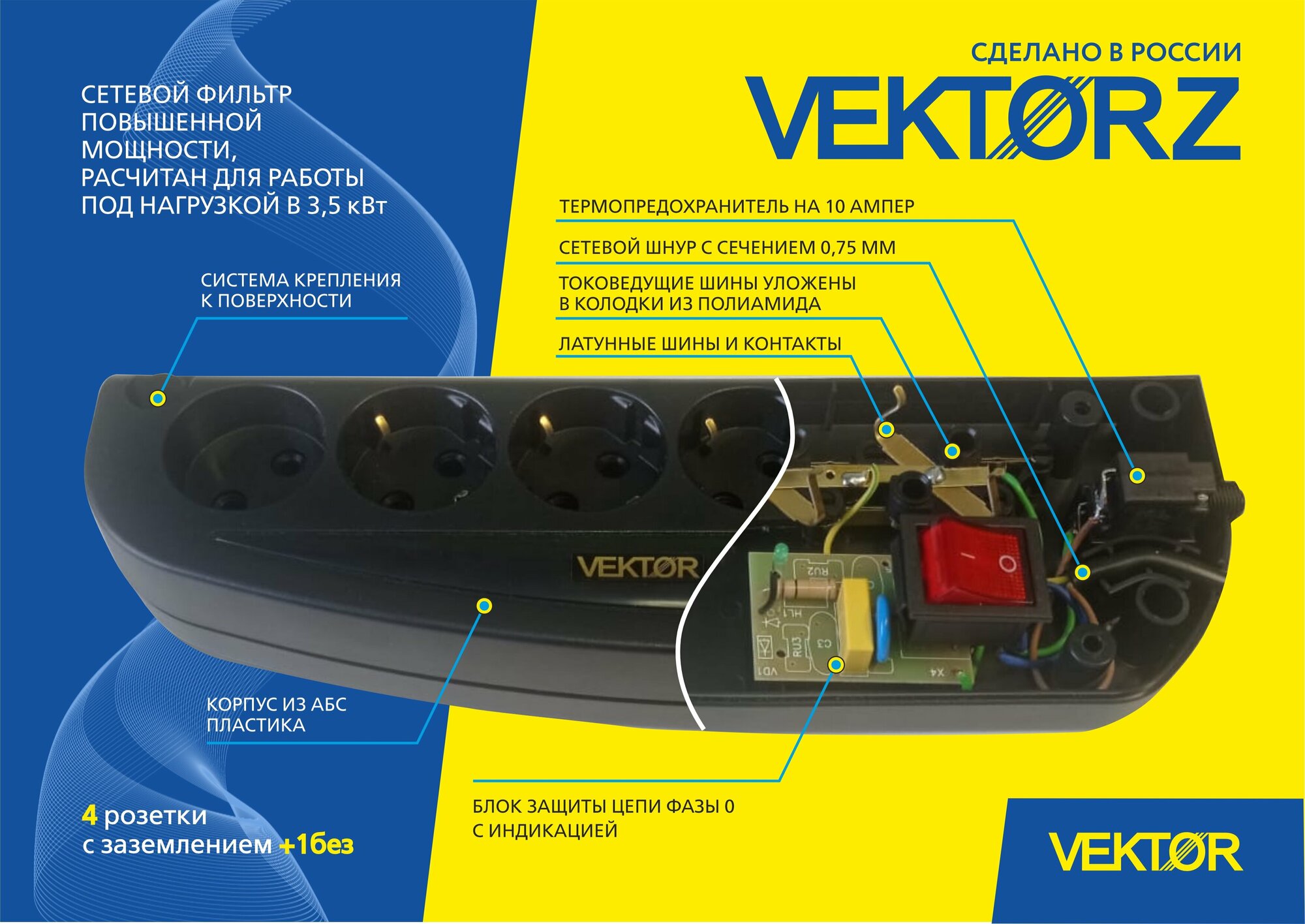 10 цен на Сетевой фильтр Vektor Z, 4 роз. c/з, 1 роз б/з, 3,0м (3,5кВт, 16А), черный