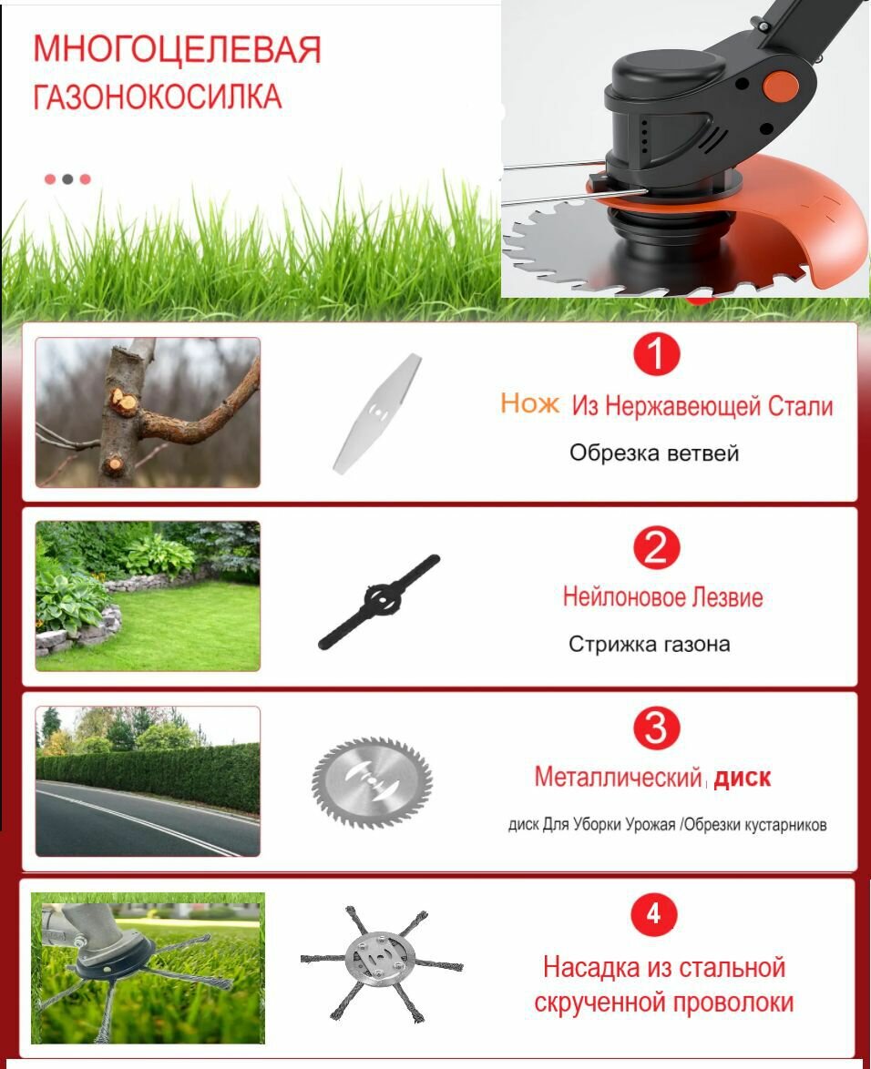| Подробная комплектация | Триммер; 1 шт. - пильный диск; 2 шт. - металлический нож; 1 шт. - 4-х конечный нож; 10 шт - пластиковый нож; 1 шт.- леска 2 уса; 1 шт.- леска 4 уса; 2 шт - аккумулятор 21 В 36VF. 1 шт - зарядное устройство 2А; ключ; ограничитель; очки; перчатки. Инструкция. |