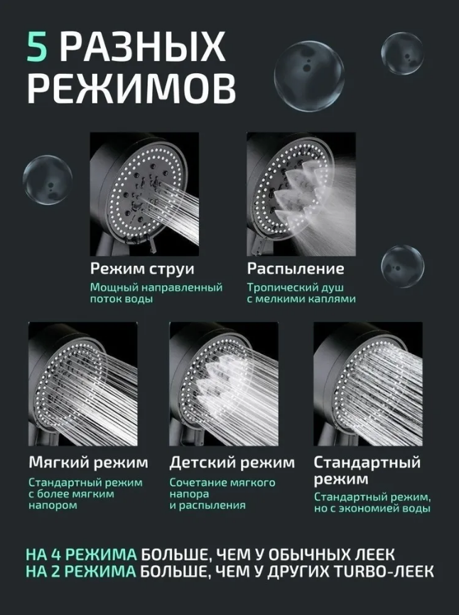 Турбо лейка для душа, 5 режимов использования. информация: