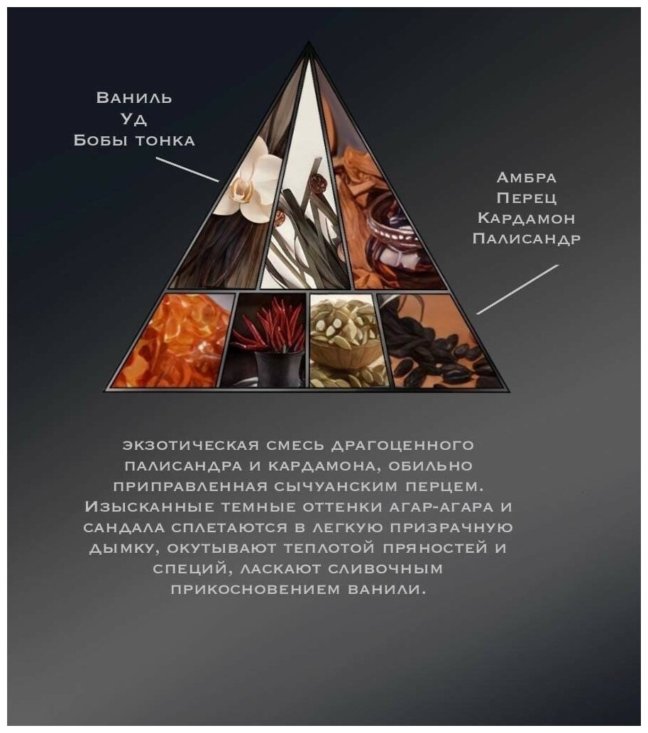 | Ноты | табак / имбирь пряные ноты / бобы тонка какао / сухофрукты/Ваниль / ветивер / бобы тонка / уд / перец / Палисандр / амбра / сандал / кардамон |