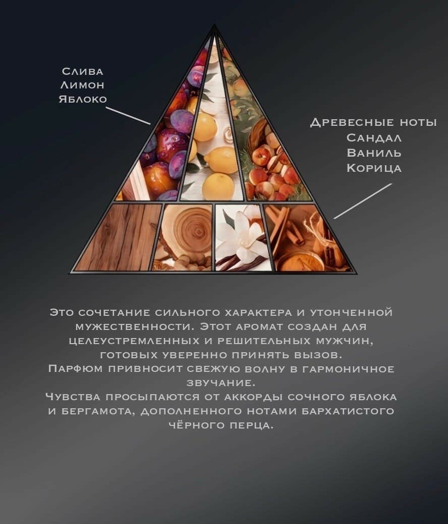 | Ноты | табак / имбирь пряные ноты / бобы тонка какао / сухофрукты/Ваниль / ветивер / бобы тонка / уд / перец / Палисандр / амбра / сандал / кардамон |