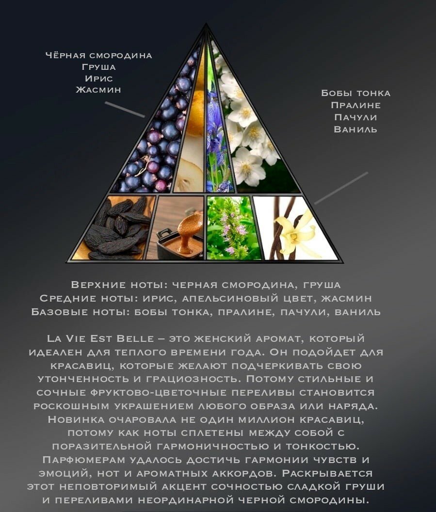 | Ноты | Верхние ноты: Черная смородина и Груша; средние ноты: Ирис / Жасмин и Цветок апельсина; базовые ноты: Пралине / ваниль / Пачули и Бобы тонка. |