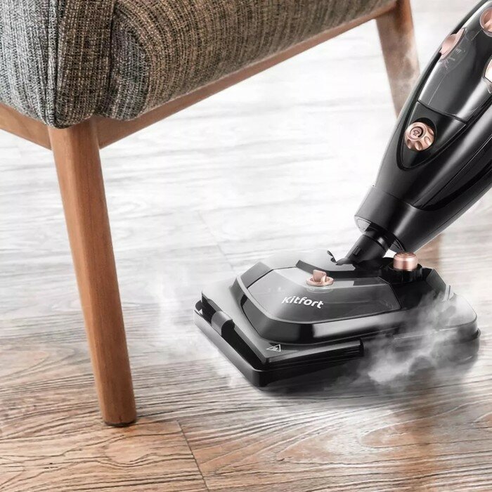 10 цен на Kitfort Паровая швабра Kitfort KT-1058, 1300 Вт, 300 мл, шнур 4.7 м, чёрно-бежевая