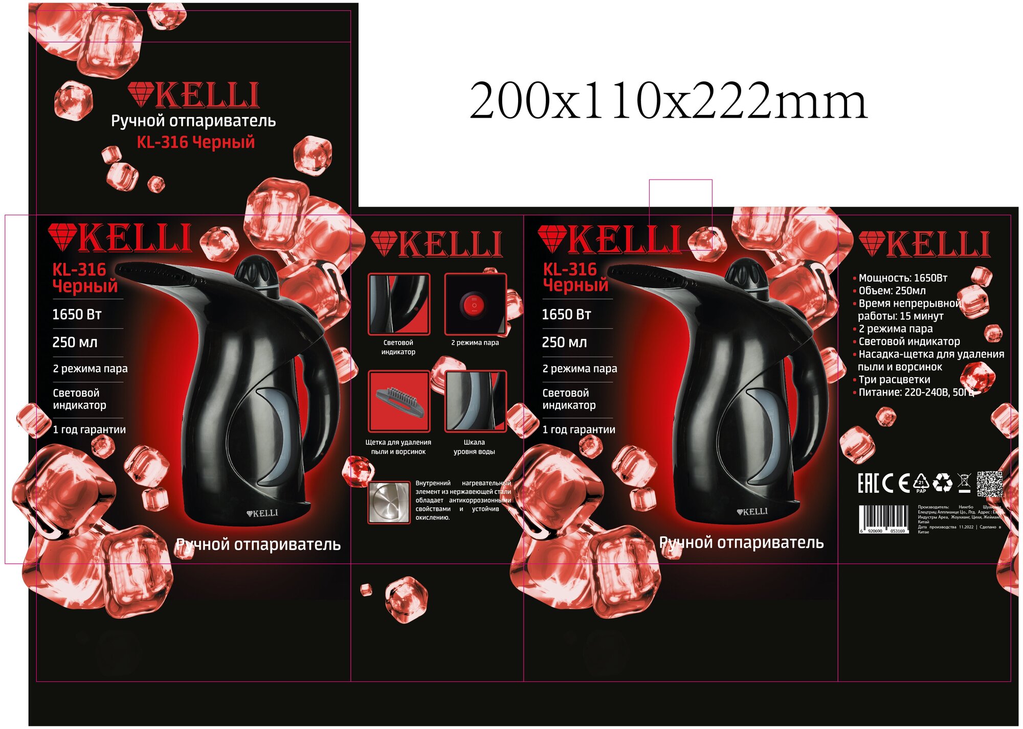 Отпариватель KELLI KL-316, ручной, 1650 Вт, 0.25 л, Черный информация: